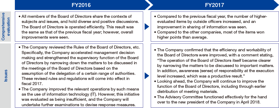 Regarding the evaluation of the Board of Directors’ effectiveness, Daifuku has a basic policy of striving to improve its effectiveness by continuously implementing the PDCA cycle. In fiscal 2017, the Company used an external organization for evaluation of the Board of Directors’ effectiveness to ensure anonymity and collect more impartial opinions by answering directly to the organization. The results were analyzed on a perspective of a comparison with other companies.