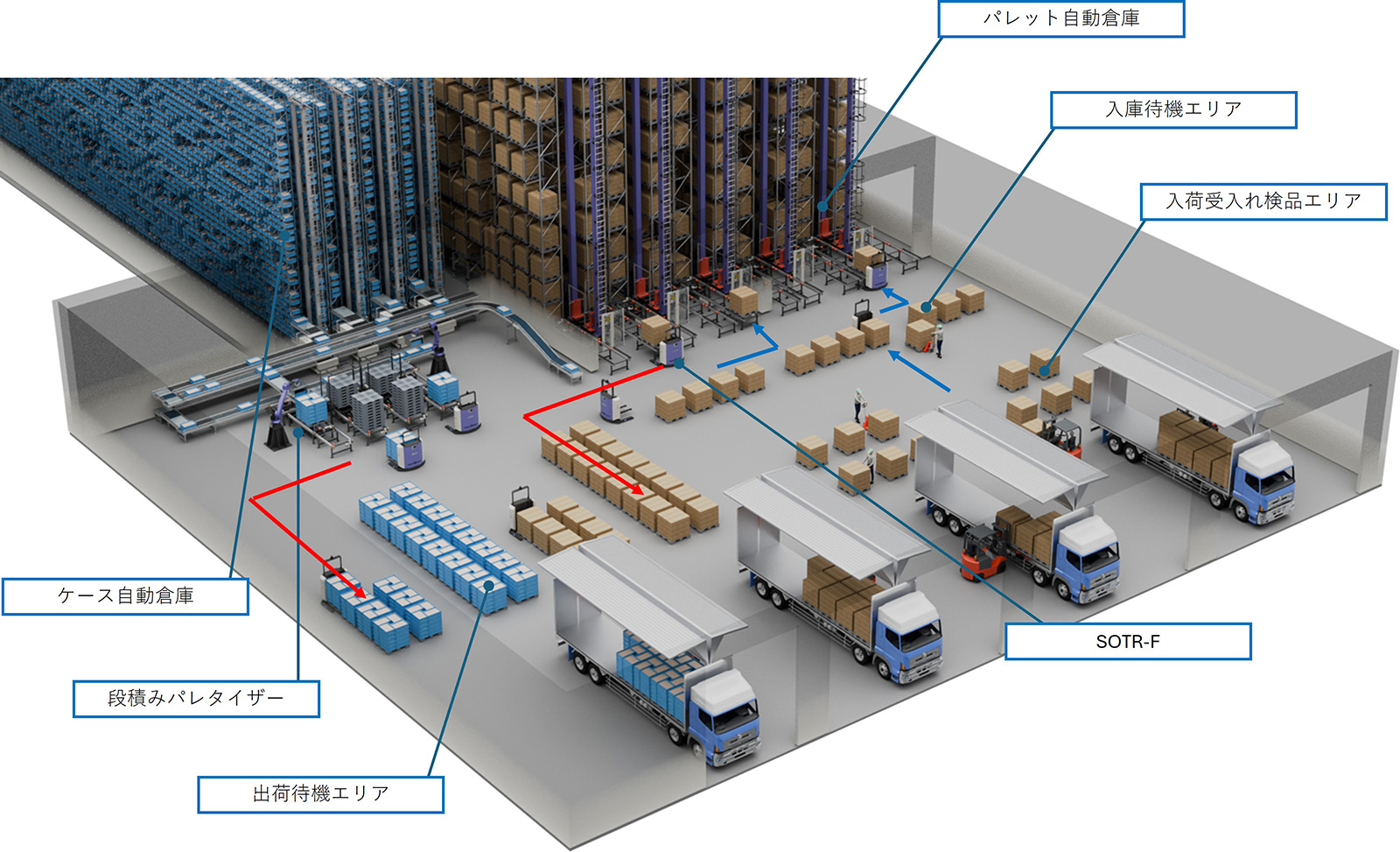 次に、生産ラインの供給指示に従い、組み立てに必要な部品を自動倉庫から出庫します。そこから搬送物に応じて、1トンまで対応可能なパレット搬送・仕分けシステム「SOTR-L」や30キロまで対応可能なケース搬送・仕分けシステム「SOTR-M」が生産ラインへ供給。仕掛品は必要に応じて自動倉庫に一時保管。最終的に完成した製品は、自動倉庫からSOTR-Fが荷捌き場に搬送するといった流れです。