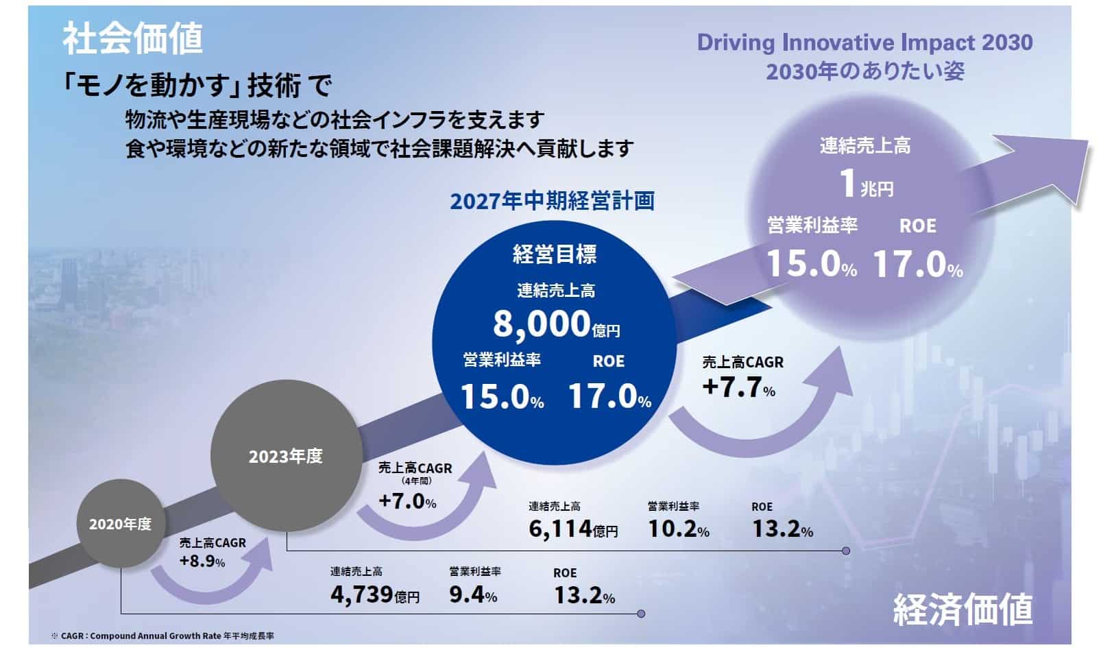 当社グループは、『未来を見据えた新たな発想での取り組みを強化し、ステークホルダーへ革新的な影響を生み出すことにより、目指すべき経済・社会価値を実現する』との強い想いを込めて、2030年のありたい姿として長期ビジョン「Driving Innovative Impact 2030」を設定。その中間点となる「2027年中期経営計画(2024年4月から2027年12月までの3年9カ月)」を策定し、達成に向けた取り組みを進めています。また2026年2月には、2025年度までの実績・進捗を踏まえて、2030年のありたい姿および2027年の経営目標を上方修正するかたちでアップデートを実施しました。