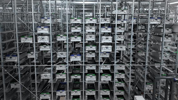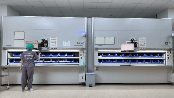 これらの課題に対応するため、センカン総合病院は、在庫管理システム(WMS)や設備監視・制御ソフトと連携した自動マテリアルハンドリングシステムを導入しました。本システムは、滅菌済み手術器具コンテナの中央保管庫として機能し、病院の追跡管理システムと連携することで、在庫の可視化と手術室への計画的な供給を実現しています。